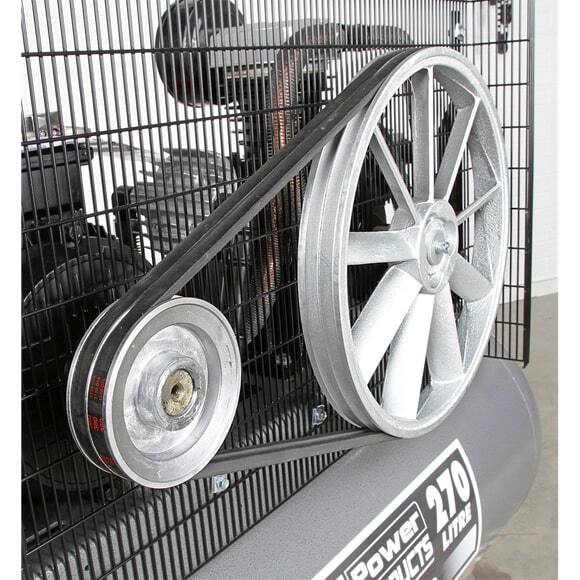 Heavy-duty drive guards protect belt and flywheel that is designed to force air over the pump to aid cooling.